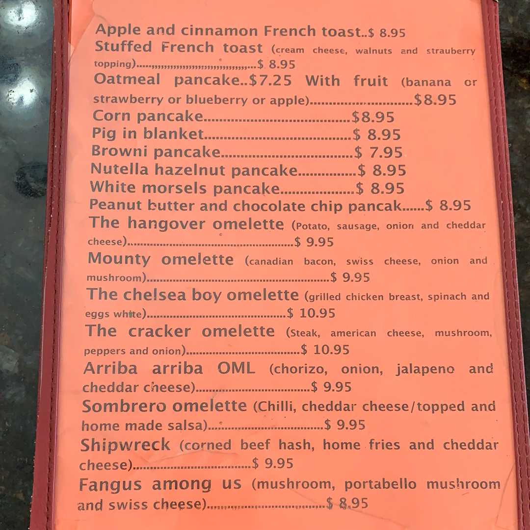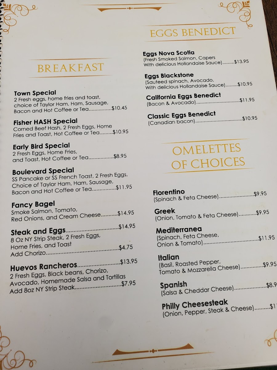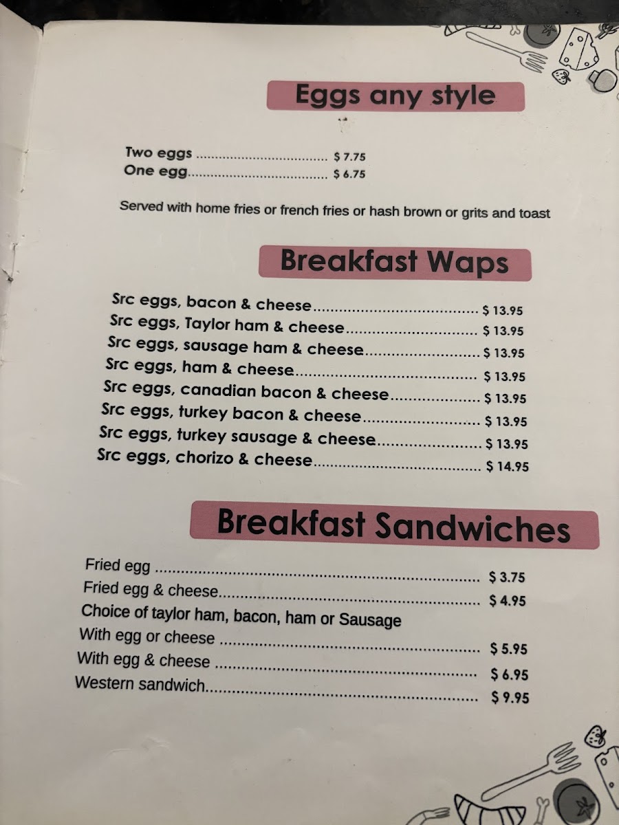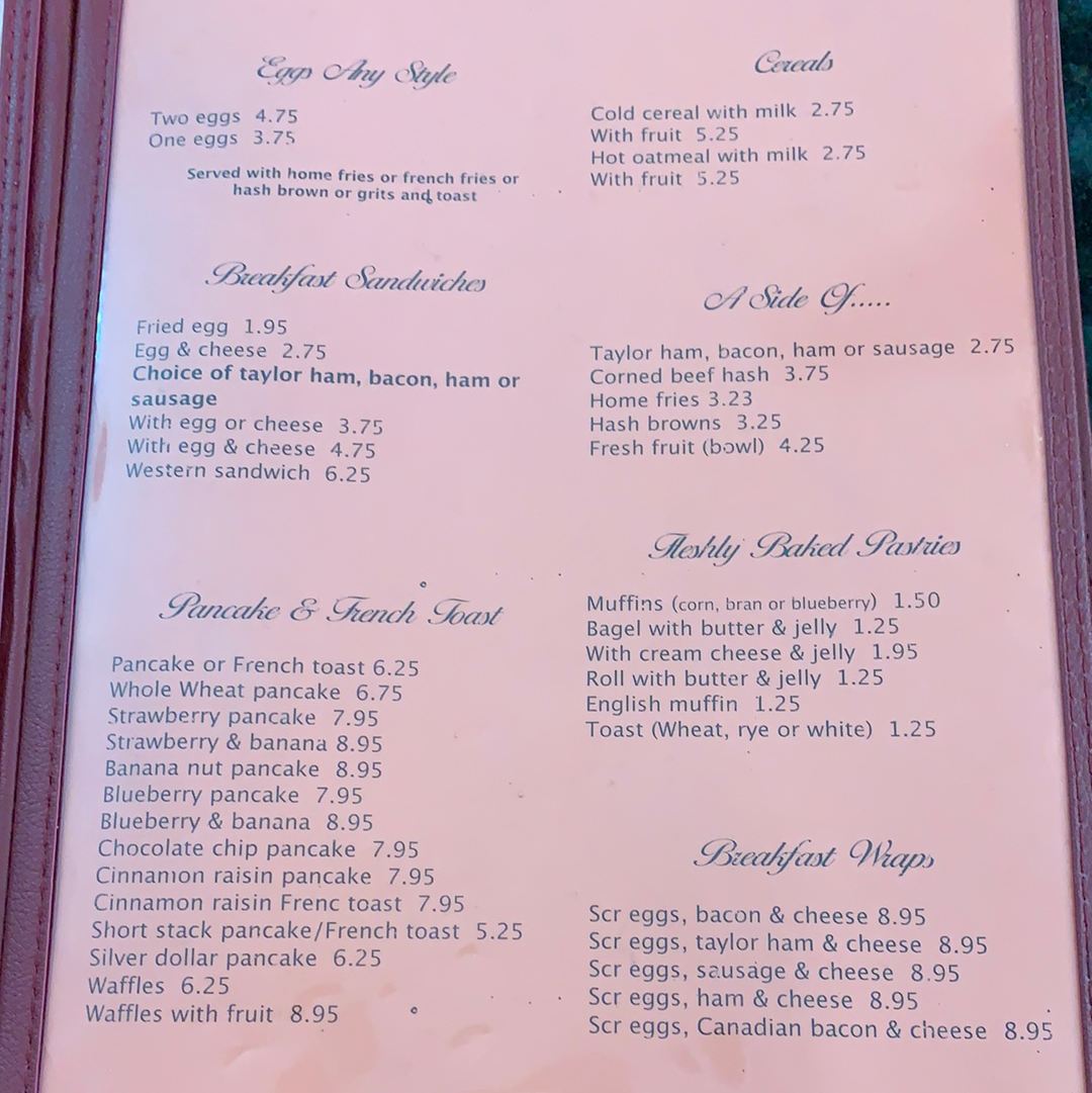 2 Fresh eggs, home fries and toast, choice of Taylor ham, ham or bacon coffee or tea.