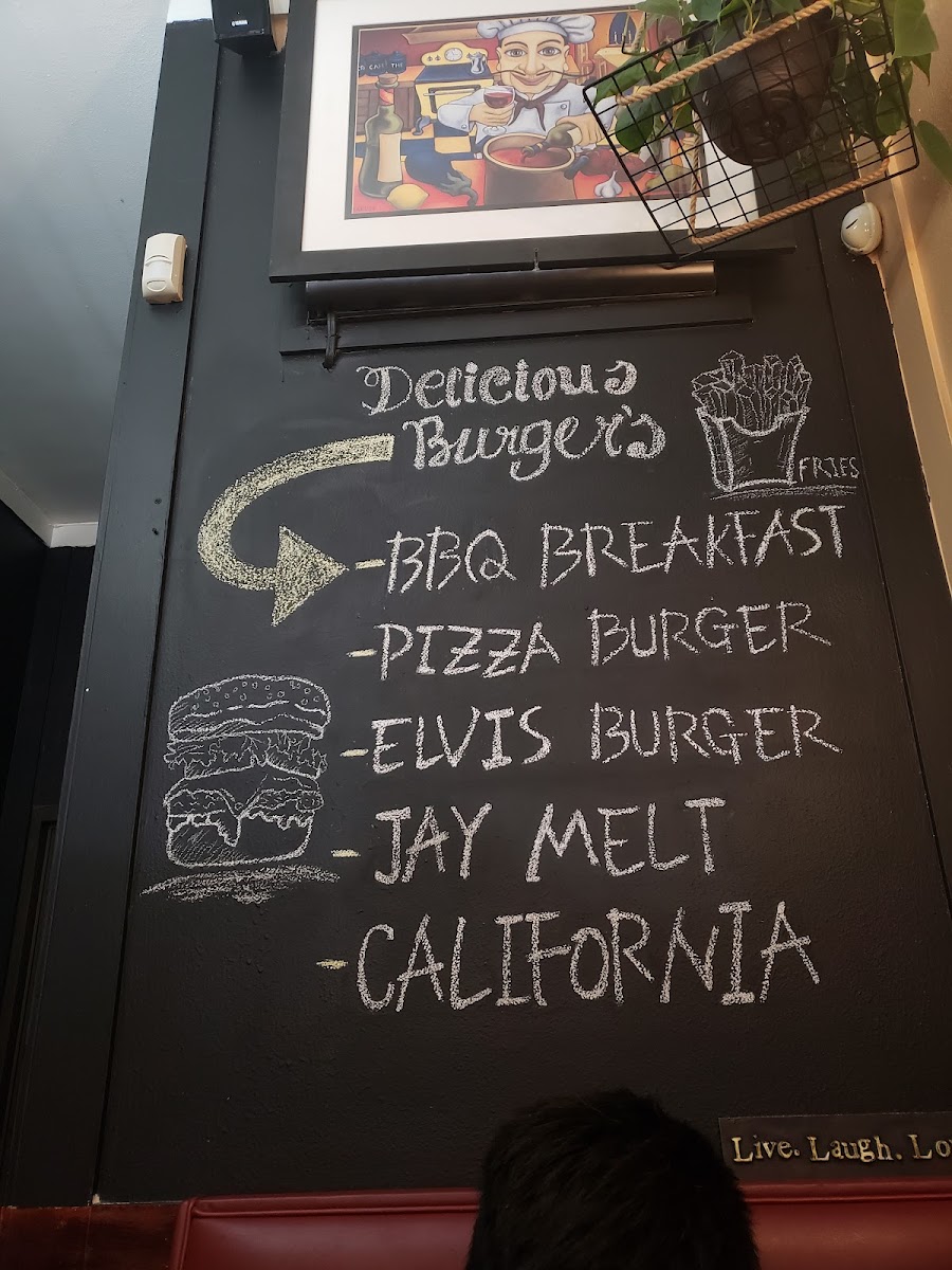 BBQ sauce, bacon, cheddar cheese, topped with a fried egg.